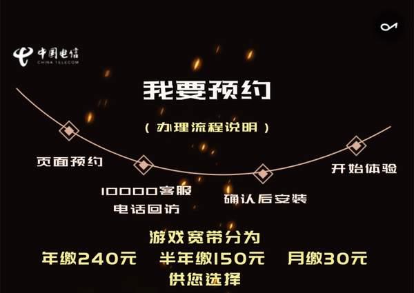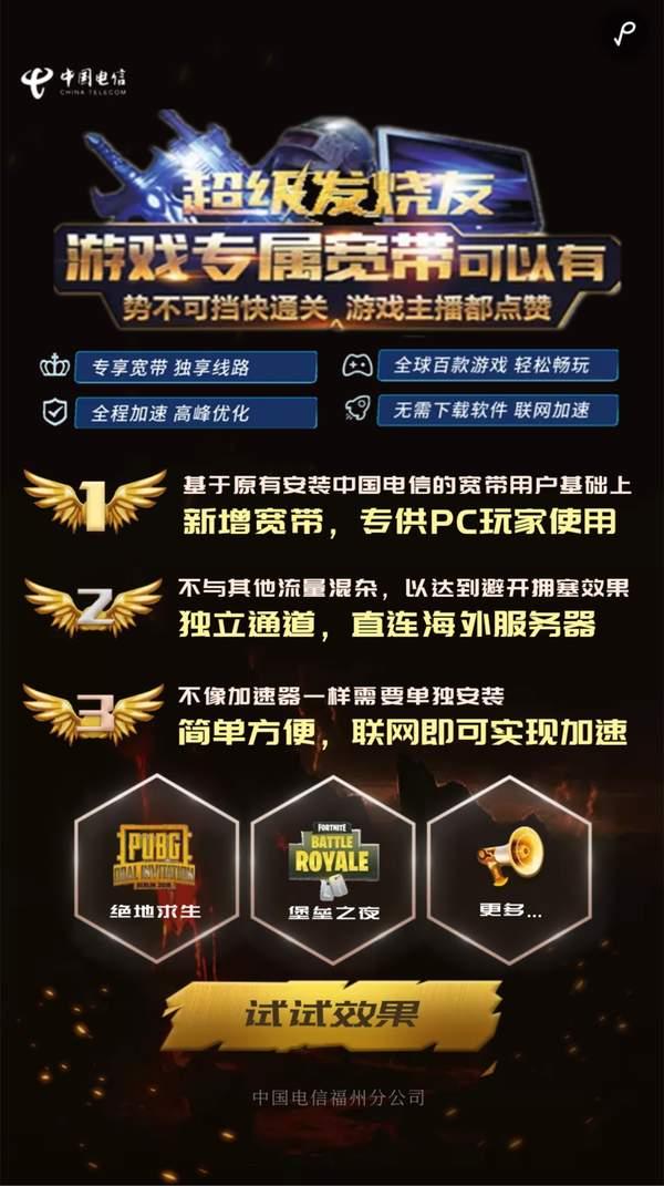 而看到宣传的页面,我们可以看到,这个中国电信的游戏专属宽带,非常给力,有着独立通道,直连海外服务器的功能,全程加速,而且无需下载任何软件,可以说是非常给力了。