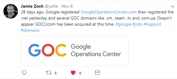 近日,海外域名博主@Jamie Zoch曝料称:一个月前,谷歌已经秘密注册了域名,并且还将.ua等后缀也都抢注了。