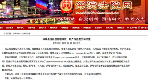 【TechWeb报道】3月28日消息,据海淀法院网消息,因认为百度公司未经其同意,擅自修改了其域名的注册信息,致使其域名变成了其他人的域名,从而失去了该域名的所有权,用户许某以计算机网络域名侵权纠纷为由将百度公司诉至法院,要求百度公司将域名还。