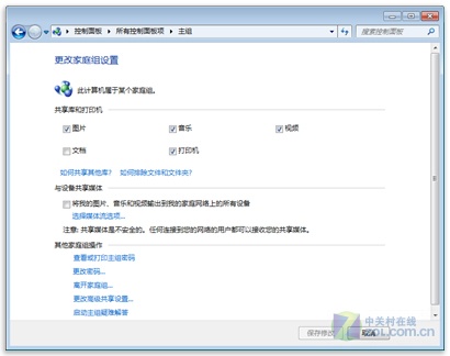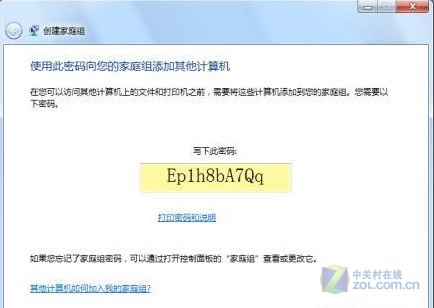 点击下一步后,Win7家庭组网络创建向导会自动生成一连串的密码,此时你需要把该密码复制粘贴发给其他电脑用户,当其他计算机通过Win7家庭网连接进来时必须输入此密码串,虽然密码是自动生成的,但也可以在后面的设置中修改成你们都自己熟悉密码。点击“完成”,这样一个家庭网络就创建成功了,返回家庭网络中,就可以进行一系列相关设置。