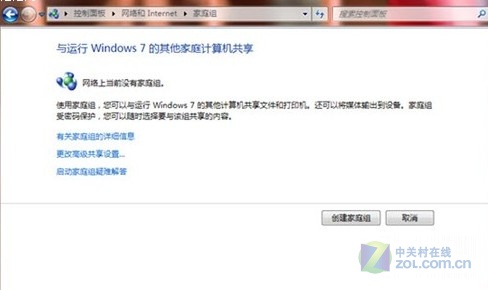 在Win7系统中打开“控制面板”→“网络和Internet”,点击其中的“家庭组”,就可以在界面中看到家庭组的设置区域。如果当前使用的网络中没有其他人建立的家庭组存在的线提示你创建家庭组进行文件共享。此时点击“创建家庭组”,就可以开始创建一个全新的家庭组网络,即局域网。