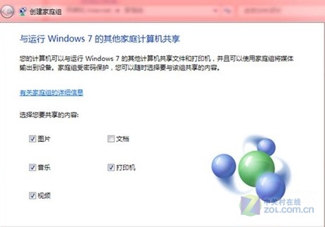 打开创建家庭网的向导,首先选择要与家庭网络共享的文件类型,默认共享的内容是图片、音乐、视频、文档和打印机5个选项,除了打印机以外,其他4个选项分别对应系统中默认存在的几个共享文件。