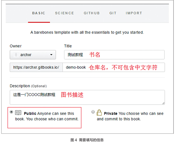 然后在弹出的对话框中填写以下信息,再点击“Create Book”即可完成在GitBook中创建图书仓库,如图4所示。