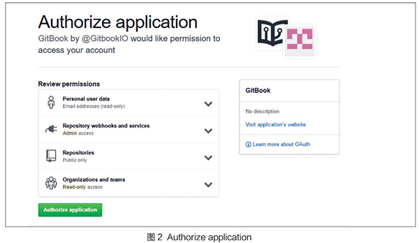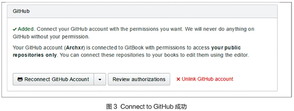 6.授权确认后会跳转回GitBook的SETTINGS页面,此时GitHub面板处会如下图所示,否则请重试以上步骤,如图3所示。
