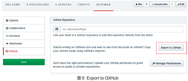 接下来将此仓库导出到GitHub中建立两个仓库的关联,导出到GitHub中是因为发挥GitHub在协同工作方面的优势,并且便于统计每个人的贡献量以及问题追踪等。建立好关联之后两个仓库的代码就完全同步了,即在GitHub仓库中做出改动会自动同步到GitBook仓库中,反之亦然。