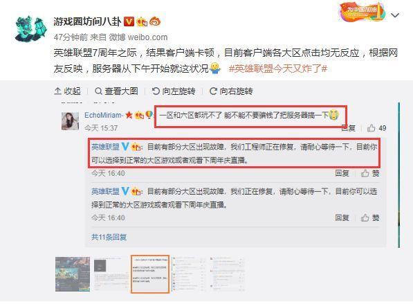 不愧是官方微博,回复起网友们诉求也很官方,直接说目前只是部分大区出现故障,现在工程师们正在紧急抢修,大家可以先去服务器正常大区游戏,最后还不忘宣传一下七周年直播,希望网友们先去看直播。这种回答方式,无异于你去网吧网上,发现鼠标有点问题,呼叫网管修电脑,网管却让你换个机子,或者自己带一个鼠标。