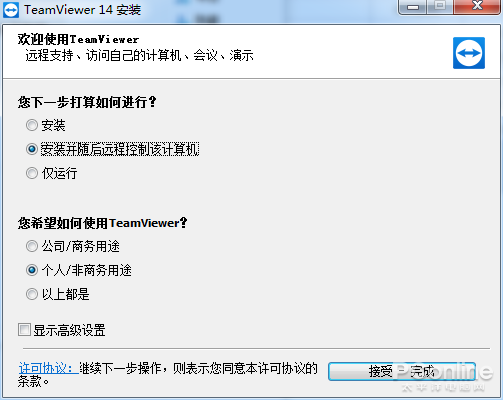 TeamViewer的安装和普通软件区别不大,需要注意的是如果你用的是Win7或者Win10,那么在某些设置的情况下,安装时需要用管理员模式运行,不然可能会安装失败。