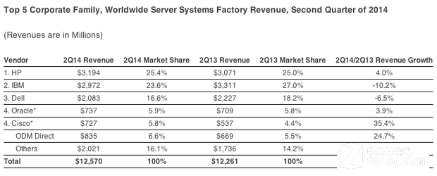 在第二季度,惠普在全球服务器市场依然处于领先地位,市场份额上升到25.4%,这主要是由于其基于x86的ProLiant服务器的需求提高。IBM尽管受到收购业务的影响,但是仍然坚强的以23.6%的市场份额在本季度排名第二。戴尔在全球服务器市场继续保持全球第三的位置,市场份额为16.6%,Oracle和思科截止本季度排在第四和第五的位置。