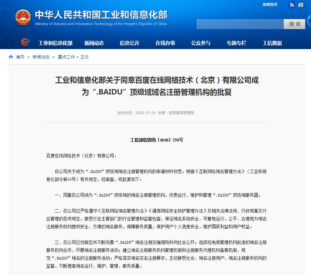 人民网北京7月20日电 (易潇)今日,工业和信息化部官方网站发布公告,工信部已正式就日前百度申请成为“.BAIDU”顶级域域名注册管理机构一事做出正式批复,同意百度公司成为“.BAIDU”顶级域的域名注册管理机构,负责运行、维护和管理“.BAIDU”顶级域服务器。