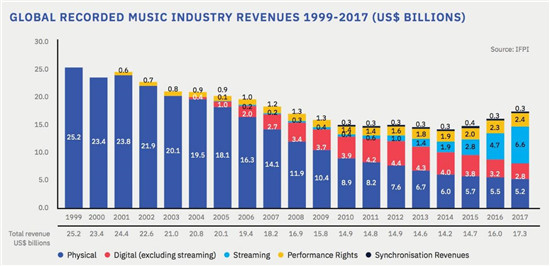 在流媒体领域,长视频领域打得头破血流,但音乐流媒体领域却是另一番光景:根据IFPI的统计,随着音乐流媒体的崛起,全球音乐产业市场的产值呈现出触底反弹的趋势。