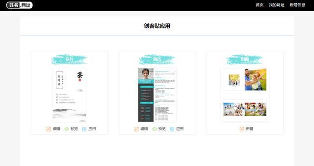 姓名.网址为网民提供了个性化的选择,满足了用户创建空间展示自我、建立网站创造价值的需求,最终形成域名、网站、个人三者之间的良好匹配。而姓名.网址与创客贴的合作,不但会为供求双方搭建一座互惠互利的桥梁,更会为用户个人主页的创建提供上万套精美模版,名片简历相册随手切换,带来出色的体验感。