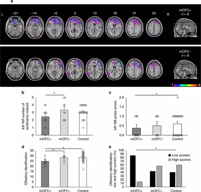 作者通过磁共振成像发现,左侧内侧眶额皮层(mOFC)的厚度以及大脑右侧海马体积增加会提升两项任务的表现水准,这说明气味识别和空间导航能力可能是由同一个脑区控制的。在补充实验中,9名曾受过脑损伤,且mOFC受损的患者在嗅觉识别和空间记忆的任务中表现不佳;相比之下,另外9名同样受过脑损伤,但并未伤及mOFC的患者却没有出现表现不佳的情况。