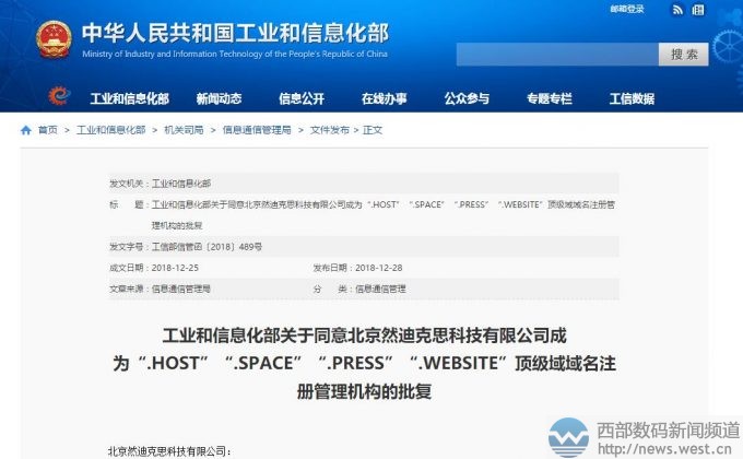 西部数码(12月28日消息,工信部官网下午发布新闻,国际新通用顶级域名.host、.space、.press、.website已于今天正式通过中国工信部最终审批,成为又一批在中国境内获得资质审批的顶级域名。