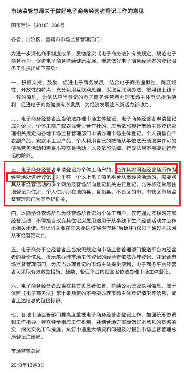 前不久,国家市场监管总局对外公布了《关于做好电子商务经营者登记工作》的意见,其中有一点很明确地指出:电子商务经营者申请登记为个体工商户的,允许其将网络经营场所作为经营场所登记。对于在一个以上电子商务平台从事经营活动的,需要将其从事经营活动的多个网络经营场所向登记机关进行登记。允许将经常居住地登记为住所,个人住所所在的县、自治县、不设区的市、市辖区市场监督管理部门为其登记机关。