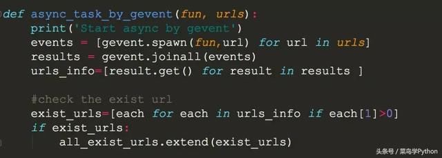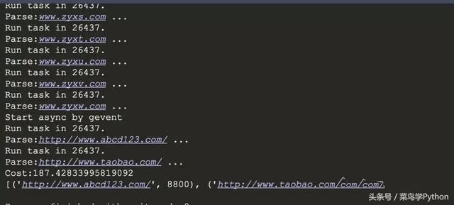 用gevent的spawn函数绑定一个需要多任务执行的函数地址和对应的传入的参数接着我们用joinall等待前面执行的事件结束即可,会返回一个微协程的结果result最后用result里面的get函数获取网页地址和对应的长度3).启动百万域名查询
