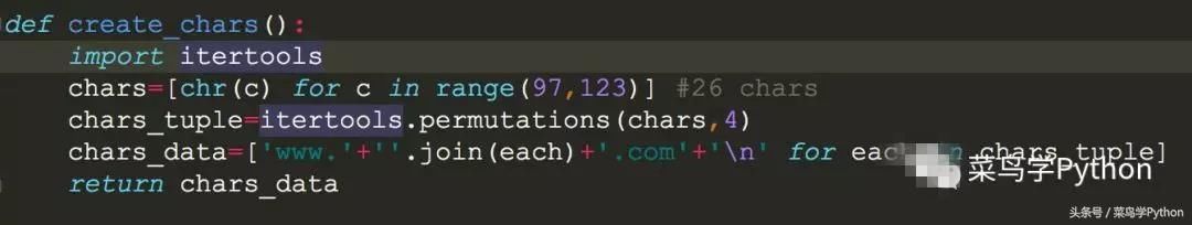 域名大部分都是字母开头的,我们这里先从26个字母里面随机挑4个字母,然后进行全排列!这个对Python来说,soeasy,2-3行代码搞定!