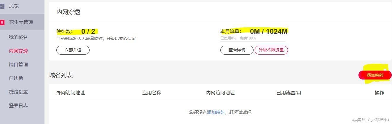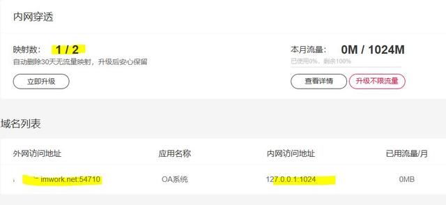 我们继续看,默认花生壳为我们提供两个映射端口数,一个月的内网穿透流量为1024M,超出这个流量范围需要付费才能使用。