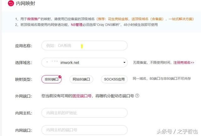 选择域名:一般我们都是花生壳为我们自动分配的一个域名,如果有自己的顶级域名,可以在后面的小箭头下选择自己想要的域名。