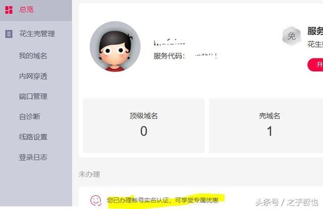 点开账户名称后,我们会看到自己的账户信息,这里要注意,如果你是新注册用户,需要实名认证才能使用花生壳的功能,实名认证很快,一般早上提交,中午就可通过。