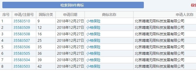 近日我接到业内知情人士的曝料:滴滴出行已申请多枚“小桔保险”商标。根据商标局官网查询的信息显示,在“北京嘀嘀无限科技发展有限公司”这个主体下,已于2018年12月27日递交了8枚“小桔保险”的商标注册申请,涵盖9类、12类、16类、25类、35类、36类、39类和42类。同一天,滴滴出行还申请了8枚“小桔车险”商标,所申请的商标类别与“小桔保险”一致。