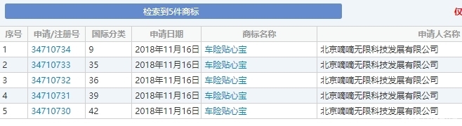 另外,滴滴出行在2018年11月16日还申请注册了5枚“车险贴心宝”商标。