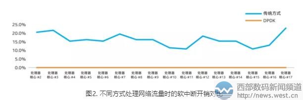 而工作在用户空间中的 DPDK,通过巧妙的内存池技术,使其与内核空间的内存交换不需要拷贝,仅需完成控制权转移即可,因此可以极大地减少资源消耗,提升数据处理效率。在西部数码进行的一项对比性测试中,由传统方式和 DPDK 方式分别处理 7G左右网络流量,从图2可以看出,传统方式有 16 个处理器内核的软中断在 10% 到 23% 之间,而 DPDK 方式几乎没有出现,这意味着使用DPDK的方式可以有效地节省宝贵的处理器资源。