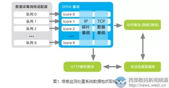 为打破这一瓶颈,西部数码与英特尔开展深入技术合作,利用英特尔开源数据平面处理神器 DPDK,构建全新的数据包抓取模块。借助 DPDK 提供的零拷贝、亲和性独占等技术,系统的数据包抓取、处理能力获得了有效的提升,从而大幅提升互联网信息监测处置系统的整体工作效能。