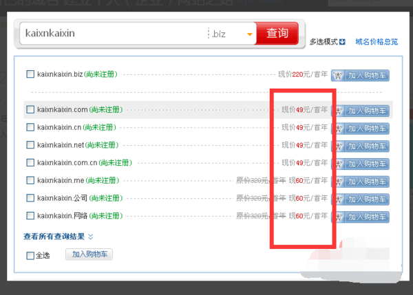 5、还有一点需要注意,不同的域名因为提供服务的服务商不同,域名价格是不同的。从图可以看出来,第一年域名价格从49元到220元之间不等。