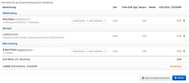 接下来可以看到刚才我们选择的三项免费服务,其中就有域名,这里我们不停的点击蓝色按钮下一步,同意注册协议一直点下去就行了。