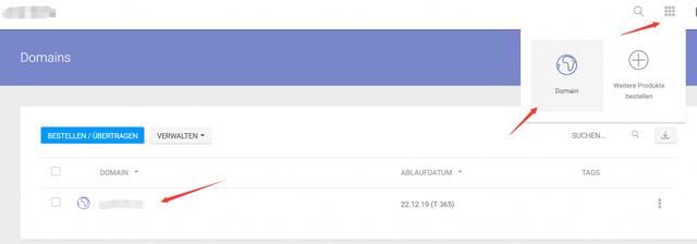 接下来在后台首页右上角,如图所示那里选择domain就可以看到自己注册的域名并管理了。