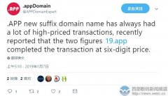 西部数码(1月10日消息,据.app域名推特(@APPDomainExpert)曝料称,近日不少.app域名成交,其中,两数字域名19.APP被曝以六位数价格完成交易。 域名19.APP注册于2018年5月份,目前的whois信...