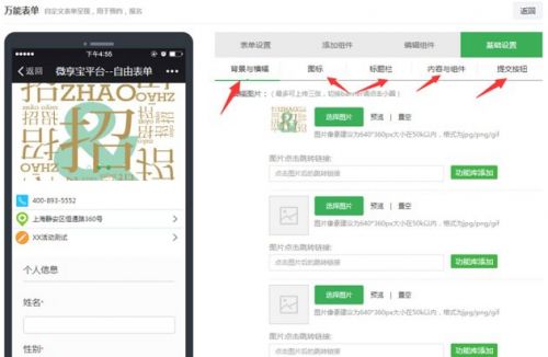 4、将选项切换到基础设置,banner图就是横幅,可以上传3张,切换横幅点击小圆圈。切换到图标、标题栏、内容与组件、提交按钮,分别设置样式,然后最下面的保存。