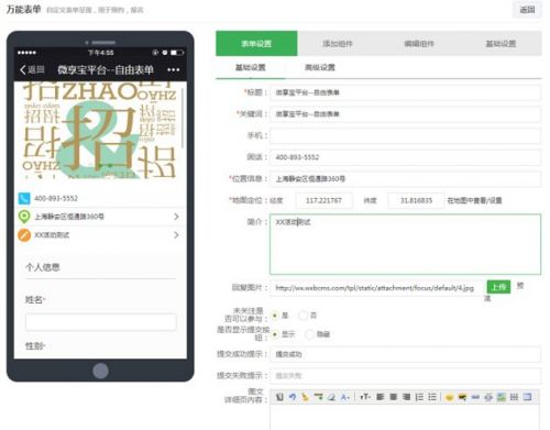 2、在左侧位置找到微互动,点开微预约万能表单报名--添加表单。编辑表单的基本内容,包括关键字,主办方的联系信,设置好切换到高级设置页面,勾选表单的有效期等其他条件的限制,认证的服务号开通了支付功能,还可以进行线上预约报名的支付。