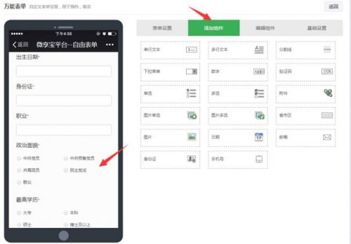 3、切换到添加组件选项;选择需要添加的组件,有几十种插件可以选择,点一下就可以到左侧预览框里,或者拖拽也行,需要多少个插件就添加多少个,左侧手机预览框里点击添加的组件就可以进行编辑,点一下右侧就出现编辑区域了,同时标签自动切换到编辑组件选项,分别设置标题、描述文字和勾选是否必填。