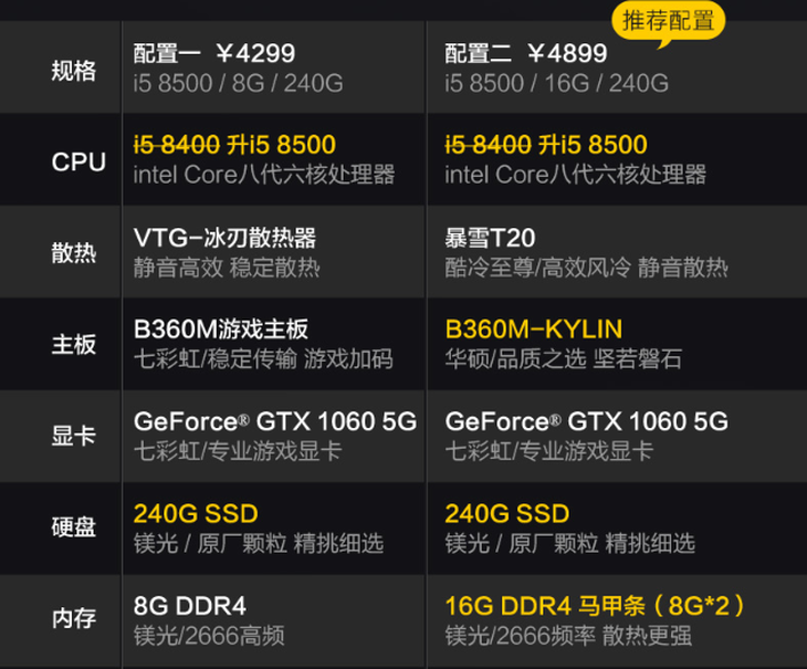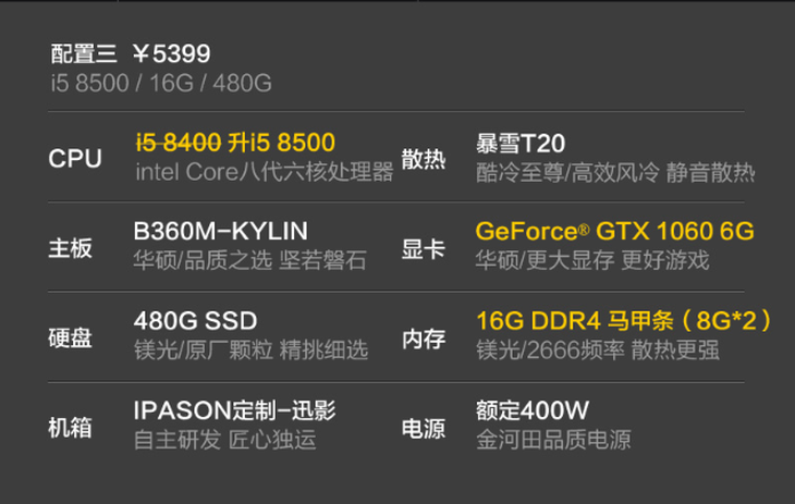 这款电脑共有三款配置,双11期间第一款配置免费升级到240G固态硬盘。配置二、三多送8G马甲内存条,价值400多元,直接组成16G双通道,并升级为240G固态硬盘。性能更上一层楼。配置三升级为500G固态硬盘,显卡升级为6G显存。