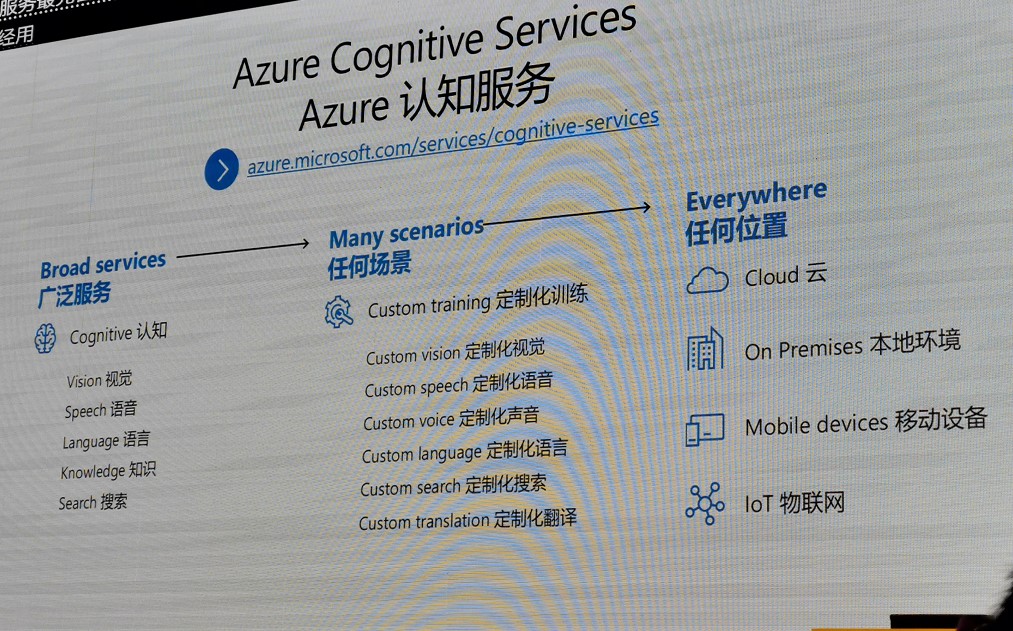 另外,微软在会上还介绍了集合微软各种AI技术的容器化的Azure认知服务。 据沈向洋介绍,Azure认知服务让任何开发者非常容易地将对象检测、图像识别、语言理解等人工智能技术融入自己开发的应用程序。而容器化作为一种分发应用程序的手段,可以将应用或者服务打包起来,只要极少甚至无需修改,即可部署在容器托管主机上。 据悉,微软首批推出的认知服务包括5个API,包括由关键词抽取、语言监测、感情色彩分析组成的文本分析容器,脸部识别容器,以及文本识别容器。有了容器化的支持,用户能在本地完成脸部识别、字符识别以及文本分析操作。目前,已经有120万开发者使用Azure认知服务。 之后,沈向洋还介绍了微软在人工智能技术领域的重大突破,包括在2016年做出的152层残差网络让图像识别准确率达到96%;2017年做出的语音识别系统在基准测试中误差率仅5.1%;2018年1月做出的文本理解系统在测试中准确率达到88.5%;2018年3月宣布机器翻译研究系统的准确率达到69.9%。沈向洋称,微软希望利用AI技术在所有感知方面超过人类水平。同时,微软还在研发OCR印刷体识别、手写文字识别等技术。 据微软全球资深院士、首席语音科学家黄学东介绍,微软基于神经网络的语音合成不仅可以媲美专业发音人,而且还简化了传统语音合成架构。目前,语音合成系统(预览版)已经上线。